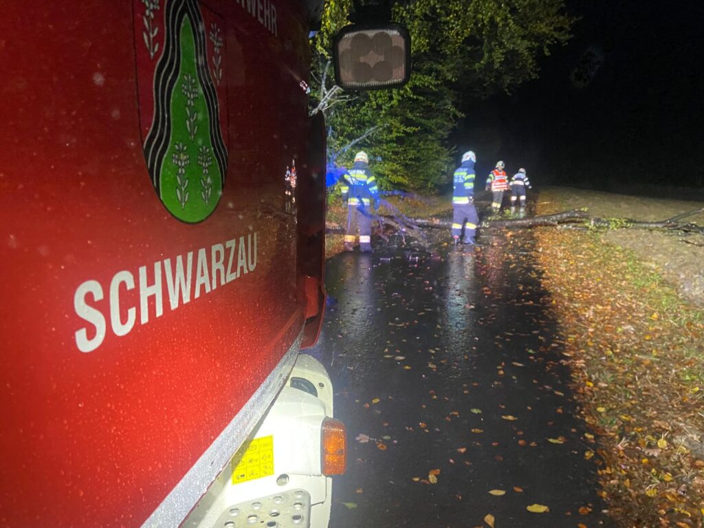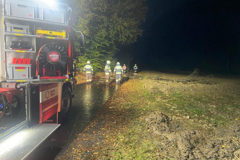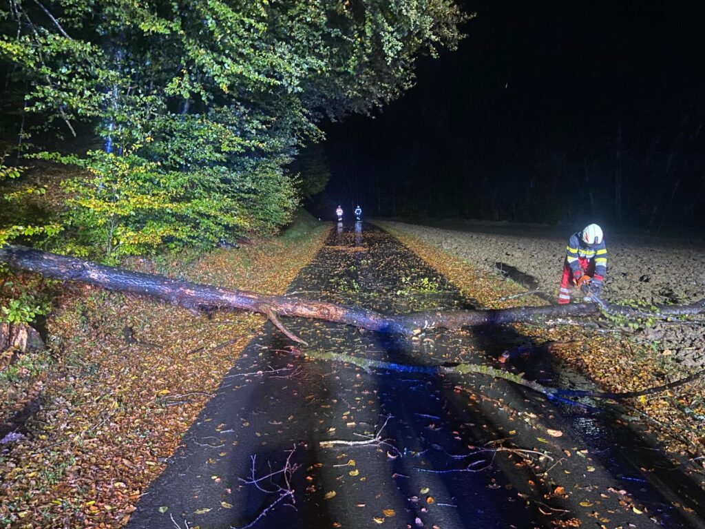 Als wir dann an diesem Donnerstag, dem 23. Oktober 2025, wenig später am Einsatzort Stelzeregg angekommen waren, hat sich das auch bestätigt. Ein Baum lag quer über der Straße und hat den Verkehr zum Erliegen gebracht.